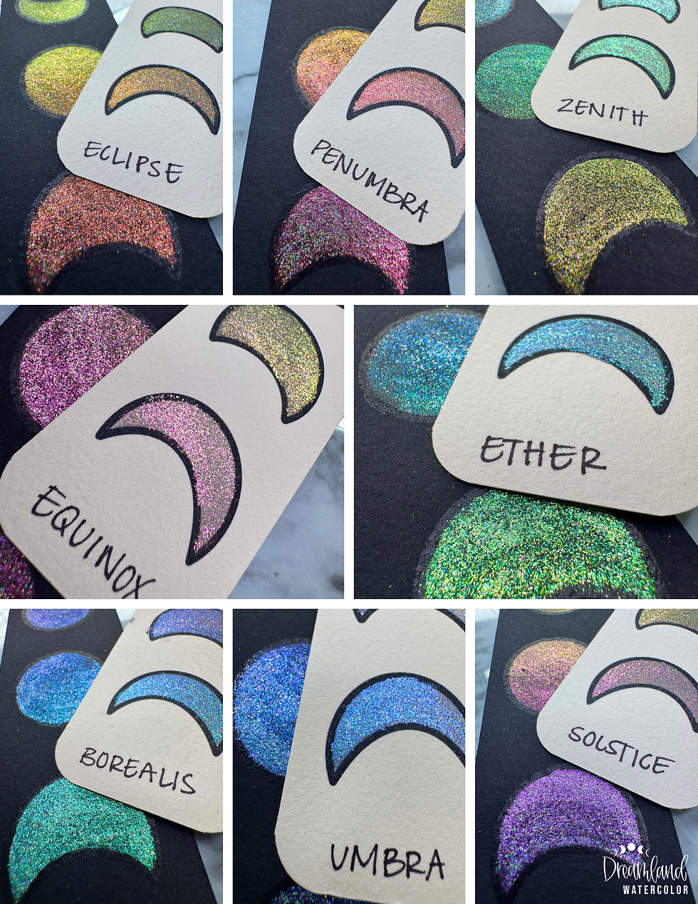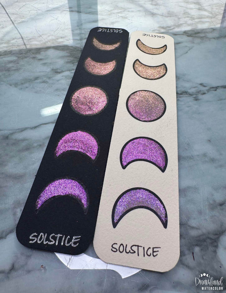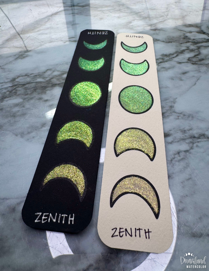 Supershifting paints are made with pigments that shift dramatically at varying angles of light. The effect can be seen incredibly well on both black and white paper.